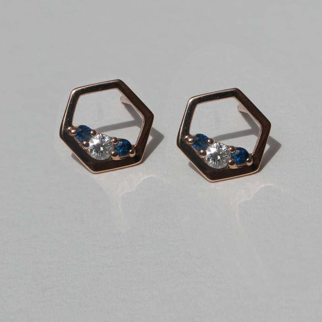 3 precious stones lavishly hanging out on a hexagon open frame. The Selena Earrings are divine to wear alone or layered with other piercings. Stylish day or night. Edgy. New age. Effortless.
