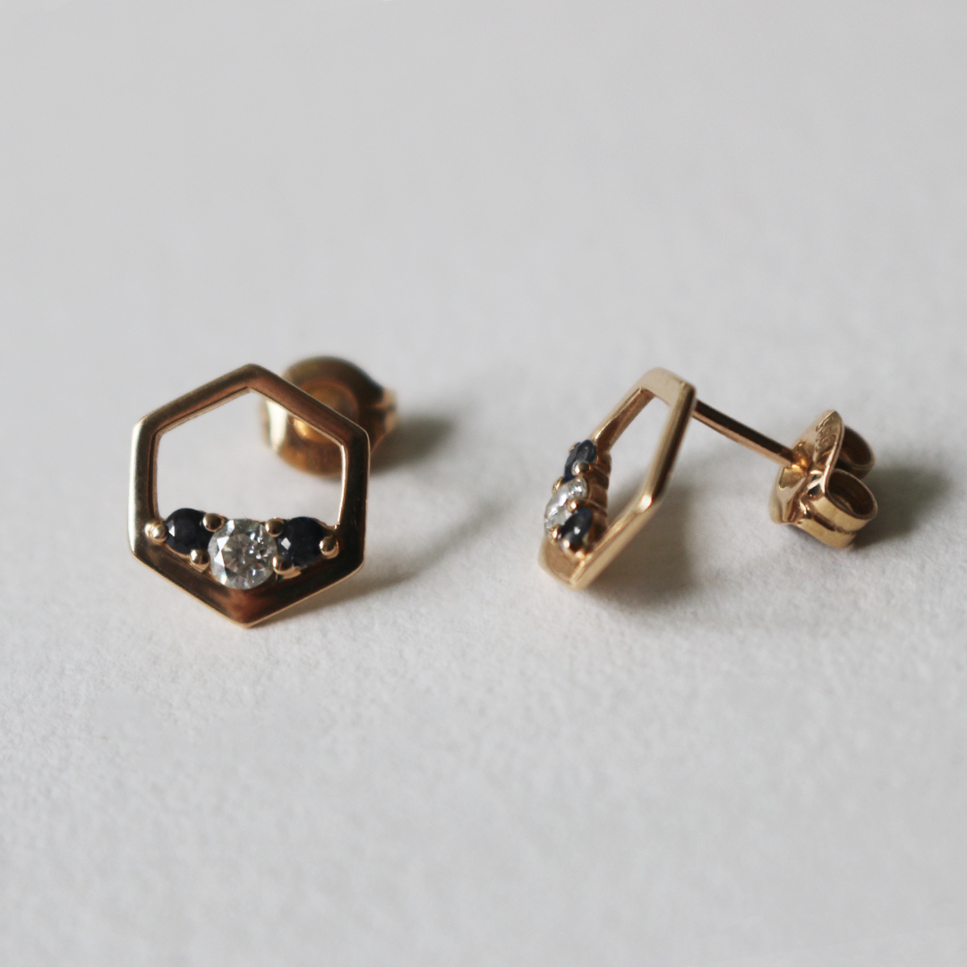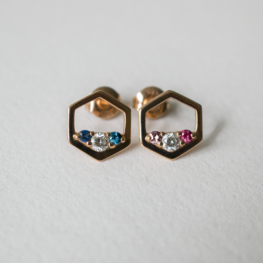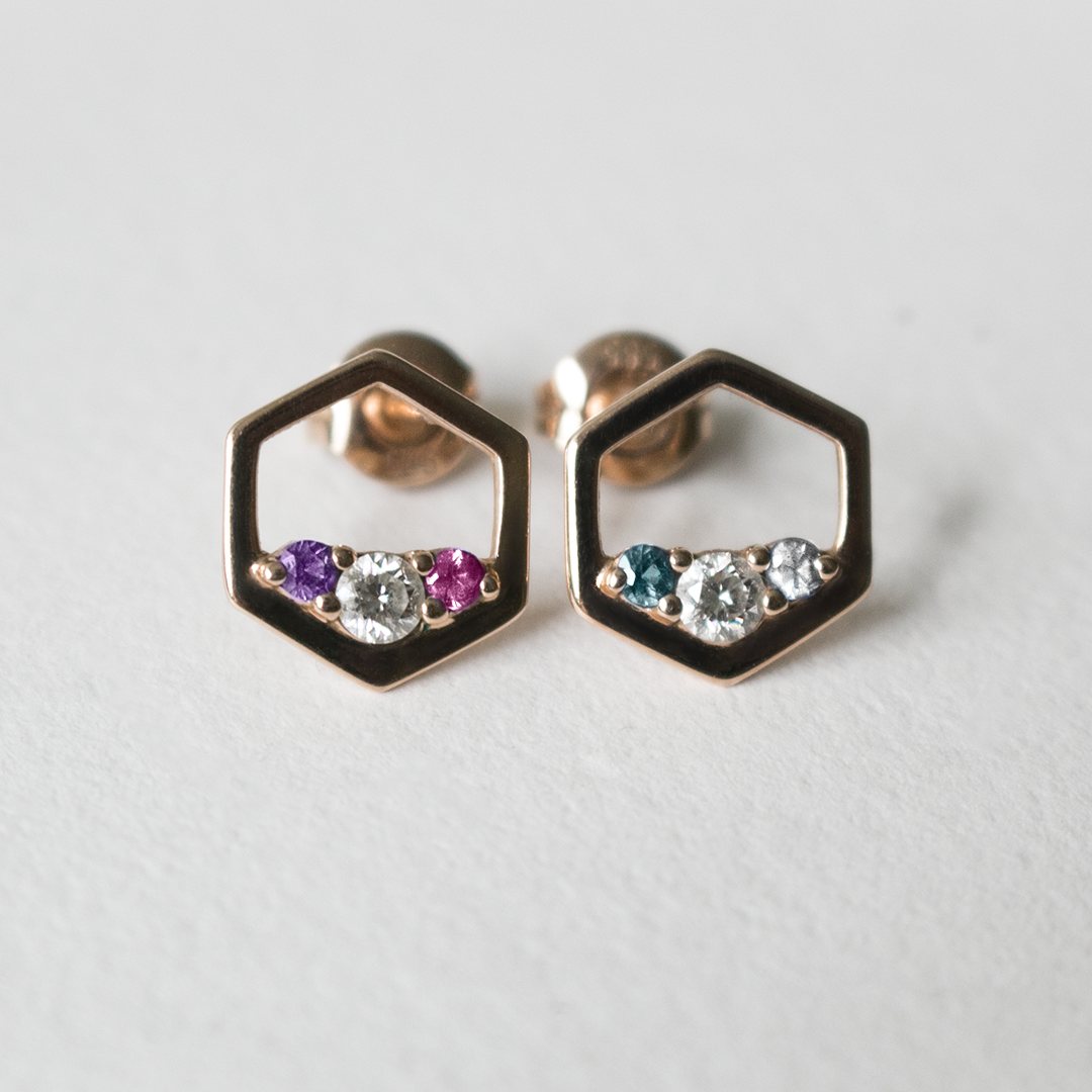 3 precious stones lavishly hanging out on a hexagon open frame. The Selena Earrings are divine to wear alone or layered with other piercings. Stylish day or night. Edgy. New age. Effortless.