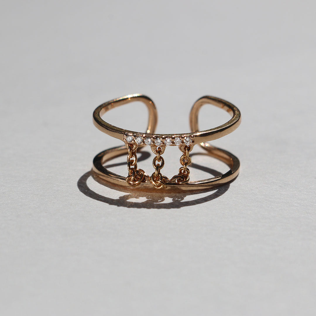 Double open band sophisticated with 3 chains to join the two fine bands. the double bands give the illusion of two seperate bands that are joined by three chains. A staple for layering or can be adorned individually. Edgy. New age. Effortless.